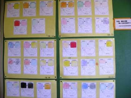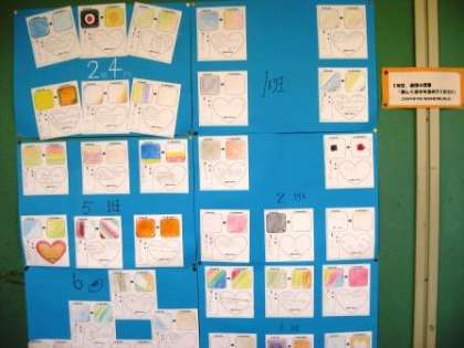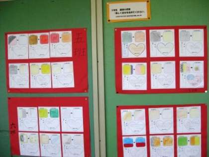 1年生が道徳の時間に自分の心を色で表現するならば、というテーマで表現してみました。いろんな色で表現されていますが、ちゃんとコメントもつけて紹介しています。とても興味深く読ませていただきました。