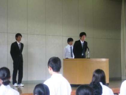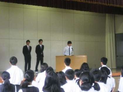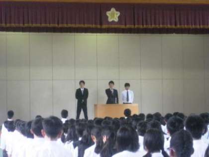 今朝の学校朝礼では3名の実習生にお礼のあいさつをしていただきました。上柚木中学校で教育実習ができたことへの感謝の言葉、体育祭の行事に一緒に参加できた喜び、教えるということの難しさと緊張感など、実り多い3週間だったようです。ぜひ教員採用試験頑張ってください!