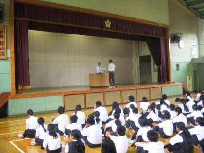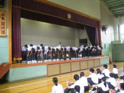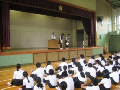 表彰の続きでは、画像左がサッカー部、中央が剣道(学校に剣道部はないのですが)、右がバドミントン部です。それぞれ立派な活躍を見せてくれました。
