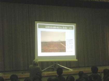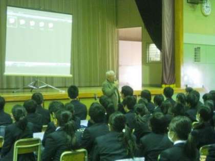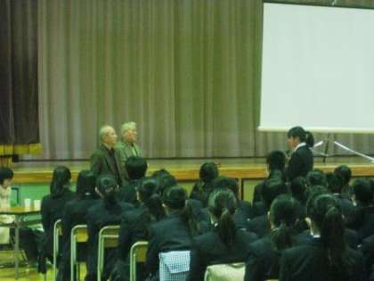 続いて、森下様からはまず、当時、母親のお腹にいたこと、父親がフィリピンに出征していたこと、母は原爆当時の様子を決して子供に話さなかったこと、幼少の頃から原爆後遺症が発症しないかといつも目に見えない不安を抱えてきたこと等、次に原爆投下直後の広島の様子を画像で紹介、最後に「生徒の皆さんは平和の尊さ、戦争の残酷さを忘れないでほしい。愚かな戦争を繰り返してはならない」等の強い思いを伺いました。後援会後に、生徒代表からお礼の言葉がありました。ご覧ください。
