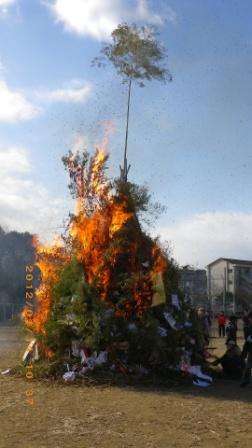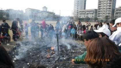 10時20分、年男、年女の小学生により塚に点火をしました。火はあっとゆうまに燃え上がり、大きな歓声があがりました。火が落ちると、梅の枝に刺したお団子をあぶりおいしくいただきました。