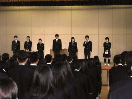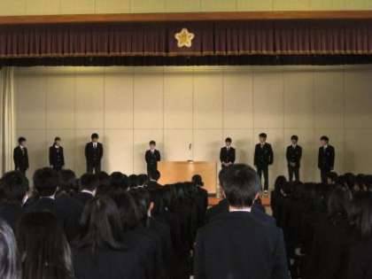 4月24日、今年度初めての生徒会朝礼を行いました。生徒会長からの挨拶、生徒会本部役員、専門委員長の自己紹介がありました。上柚木中学校がさらにより良くなるために活動していきます。