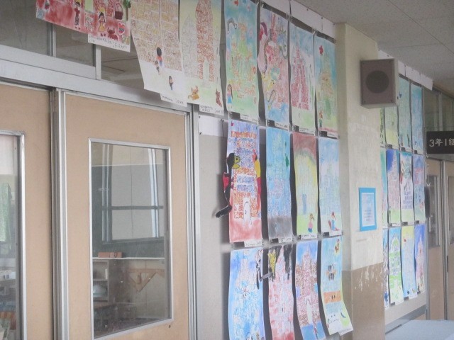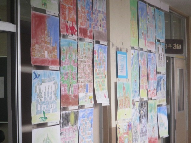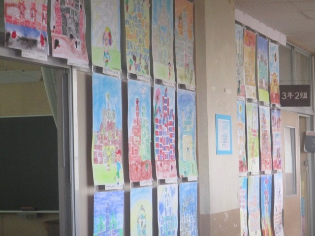 3年生はレンガを積み重ねるように絵のレンガを積み重ねて作品に仕上げました。