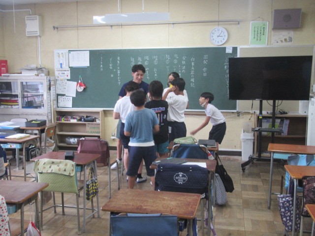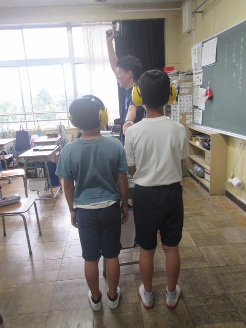 出発合図係は6年2組の教室で、ピストルの打ち方やイヤーマフを使ってみたりしました。