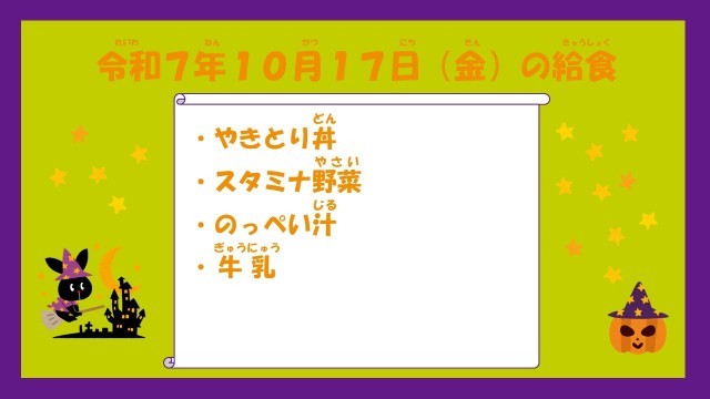 運動会で力を発揮するためには、今日の給食をしっかり食べることも大切です。バランスよく食べて、体のエネルギーをしっかりためておきましょう。そして、今日は早めに寝て、元気いっぱいで明日を迎えてください。そして、明日の朝ごはんもしっかり食べて、エネルギーを補充しましょう。