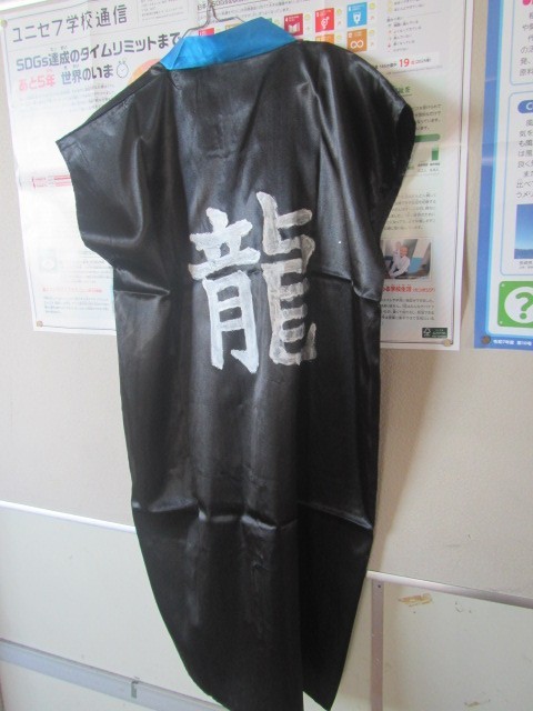 そんな校舎の中にあっても、ソーラン節の際に着るかっこいい法被が出番を待ちかねています。(写真下)