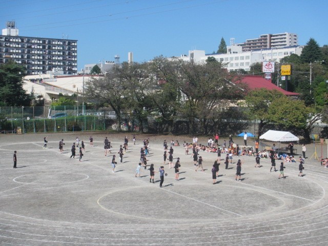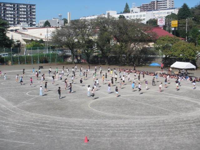 写真上:2年生 花笠を使っての表現 「くるっと花笠! つながるウェーブ! トライ・エヴリシング」