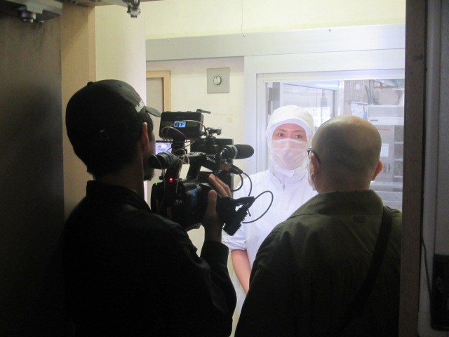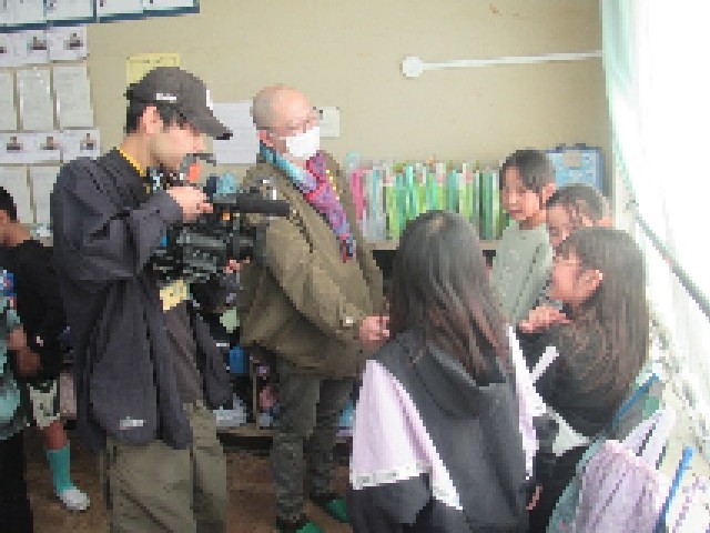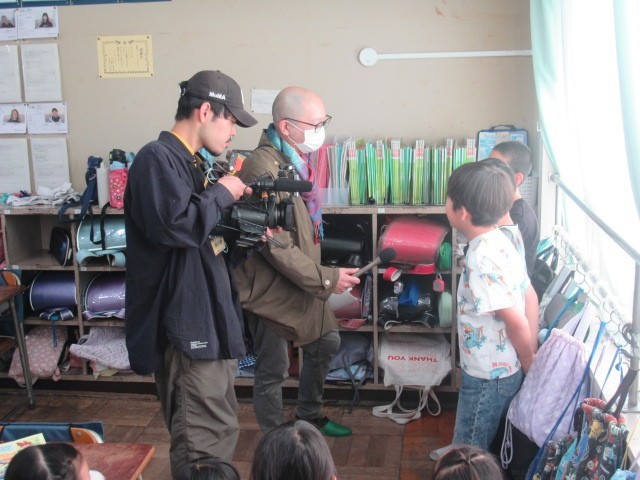 給食風景の撮影後、希望者をグループに分けてインタビューも行いました。(写真上・中)
