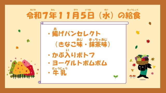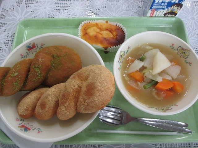 今日の給食は、「揚げパンセレクト」です。今回はきなこ味と抹茶味の2つの味です。きなこ味は給食定番の味。香ばしくてやさしい甘さが大人気ですね!抹茶味は、ほんのり苦みと甘さが絶妙なバランスです。どちらの味も、調理員さんたちが心を込めて作ってくれました。選んだ味の揚げパンを味わって食べてください。