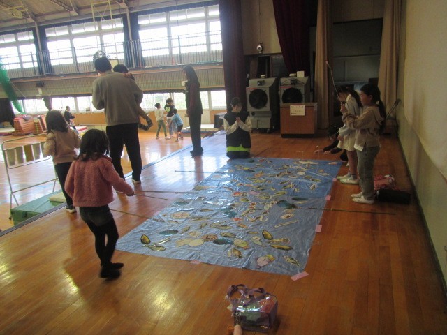 写真下:体育館のステージ上はさかなつりのコーナー。