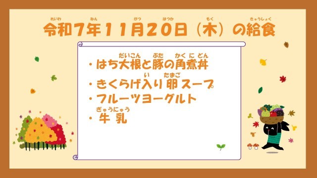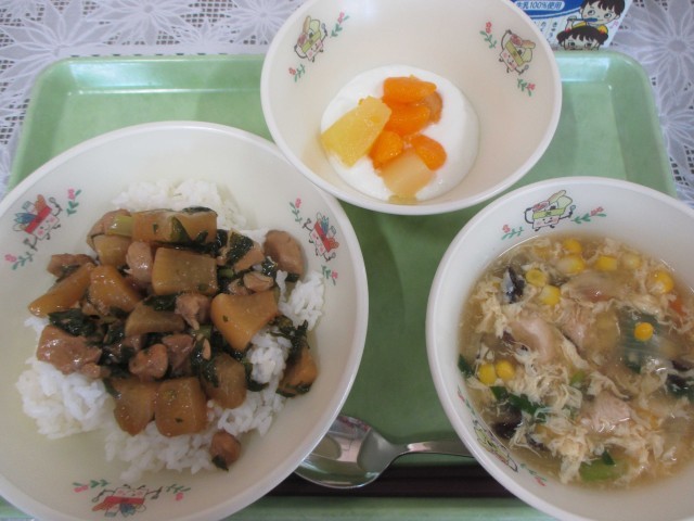 今日の給食では葉っぱも含めて、大根を丸ごと使って豚の角煮丼を作りました。