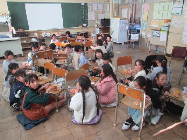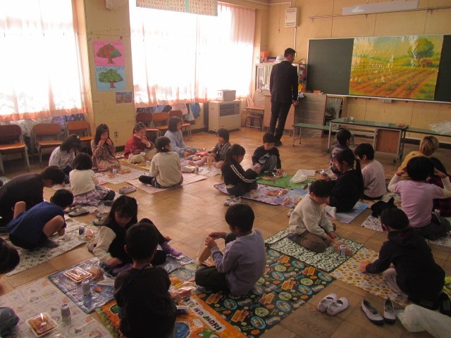 車座になったりグループで椅子を机代わりにしたり、敷物を敷いて完全にお弁当のように食べたり、クラスや学年によっていろいろでした。
