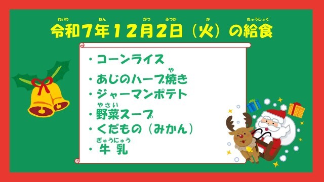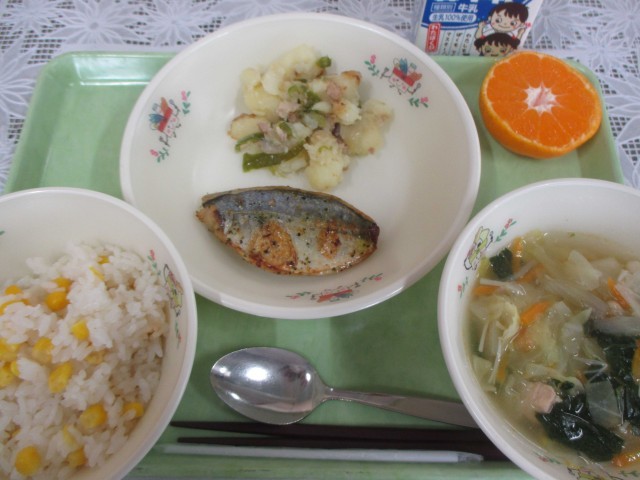 今日の給食は「五つ星献立」です。「五つ星献立」は、主食、主菜、副菜、果物、乳製品、5つがそろった献立のことです。