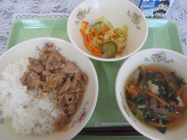 今日の給食の主菜は、「豚肉の生姜焼き」です。生姜焼きの豚肉には、ごはんなどの炭水化物をエネルギーに変えてくれる「ビタミンB1」がたくさん含まれています。このビタミンB1は、疲れた体を元気にしてくれる働きがあります。別名「やる気のビタミン」とも呼ばれています。しょうがには体を芯から温めてくれる成分が含まれています。体調を崩している児童も少なくないので、体をあたためて体調を整え、元気に過ごしましょう。