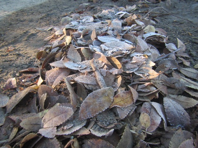 校庭の落ち葉には霜が降りてキラキラと光っていました。(写真)