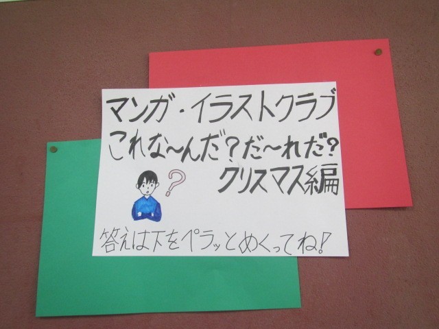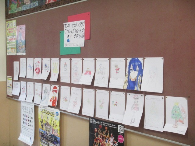 マンガ・イラストクラブは描いたイラストをクイズとして西昇降口の掲示板に掲出していました。