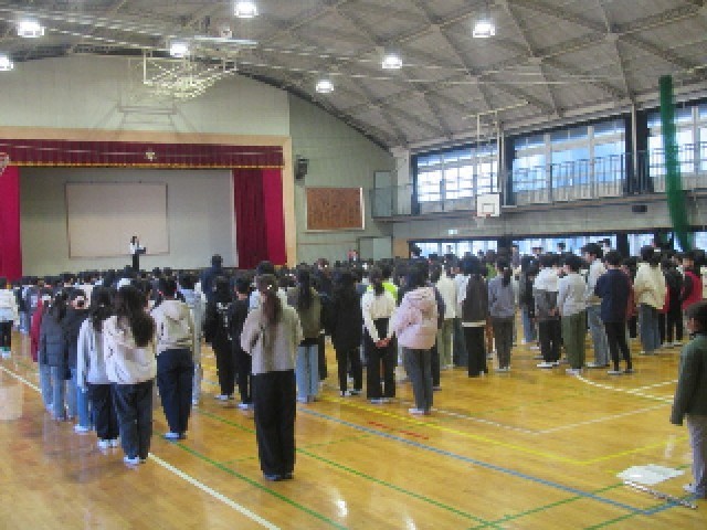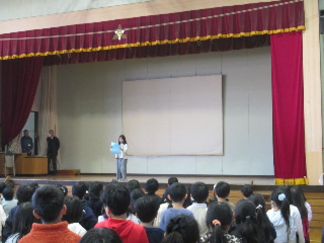 新年のあいさつをしましょう。お友だちでも、先生方でも、もちろん校長先生にでもいいですよ。そちらを向いてあいさつします。