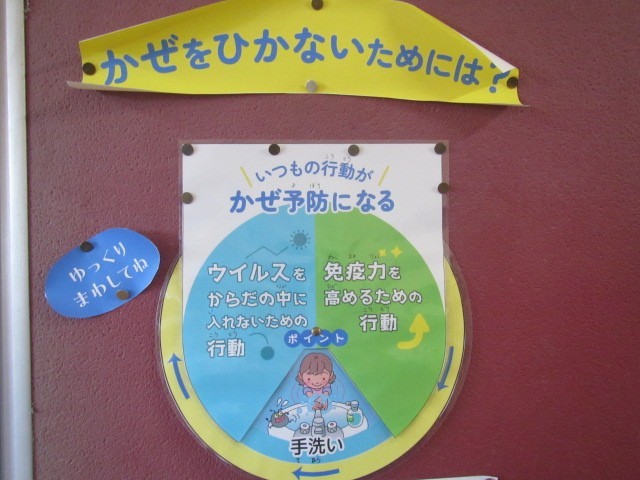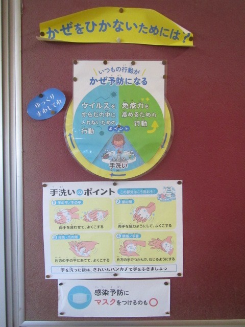 保健室前の廊下には「かぜをひかないためには?」と題した興味深い掲示があります。