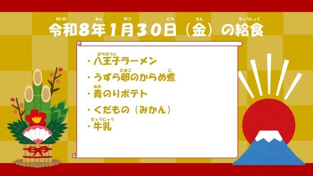 今日は、全国学校給食週間、最終日の5日目。今日のキーワードは「じ」。「地元を大切に」です。給食を通して、みんなの住む街八王子の歴史や魅力を伝えています。地元の歴史や魅力を表現した「八王子オリジナル給食」には、「桑都御膳」「八王子ナポリタン」「高尾山御膳」などがあります。今日の給食のご当地グルメの「八王子ラーメン」も人気ですね。
