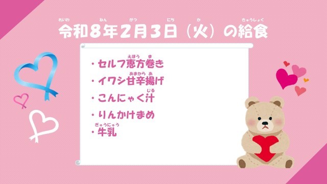 節分では、豆、イワシ、恵方巻きなどを食べます。今日の給食では「セルフ恵方巻き」を食べます。「今年も健康に過ごせますように」と願いを込めて巻き寿司を一本丸ごといただきます。そして、その年の縁起のいい方角「恵方」を向いて、福を逃さないように無言で食べましょう。今年の恵方は、「南南東」です。
