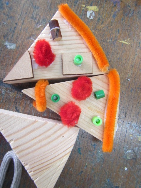 端材を使っての木工作が多く、端材が星の形のものが複数あり、何となくクリスマスツリーっぽいものを作っている人が多かったです。