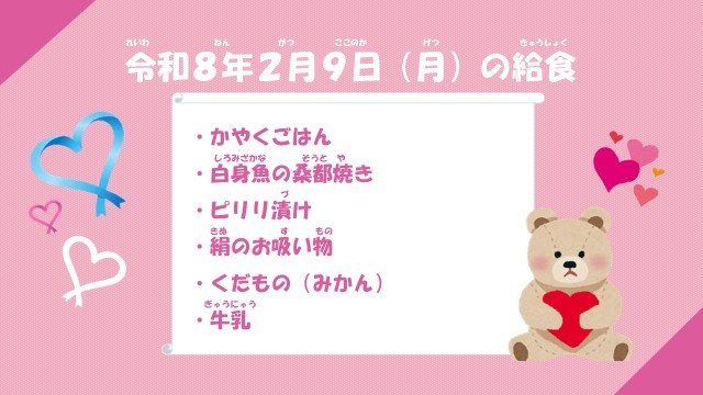 今日の給食は、桑都御膳です。みなさんもすでに知っている人は多いと思いますが、八王子市は、昔から養蚕や織物が盛んだったため、「桑の都(桑都)」と呼ばれていました。