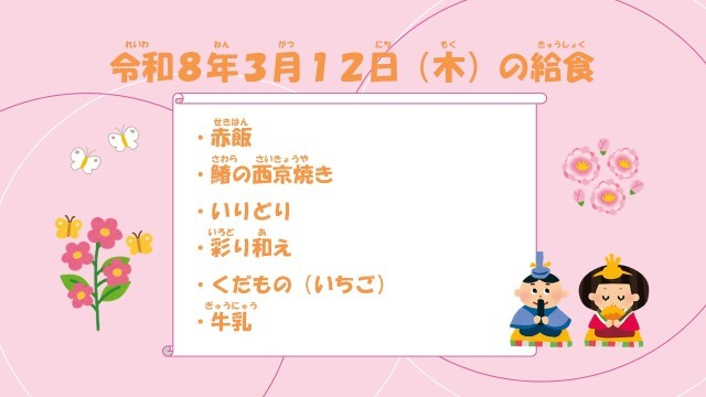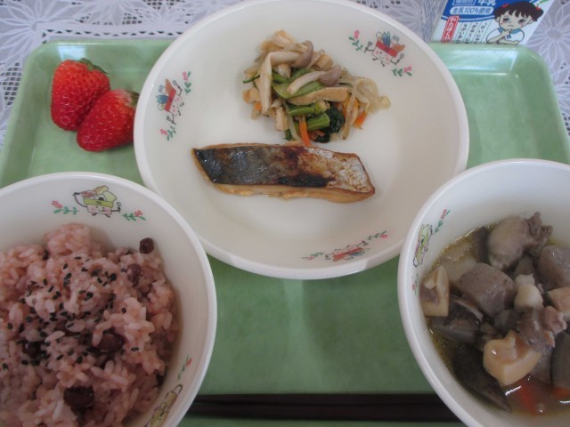 今日は卒業お祝い献立です。赤飯は、日本で昔から、お祝いの時に食べられてきた料理です。もち米にささげをまぜて炊くと、ほんのり赤い色になります。この赤い色には「悪いものから身をまもる」という意味があり、「良いことが起きますように」という願いが込められています。いりどりは、鶏肉や野菜を炒めてから煮ふくめた、昔ながらのお祝い料理です。縁起の良い食材が入ることが多く、食材のうまみがぎゅっとつまった、やさしい味の煮物です。