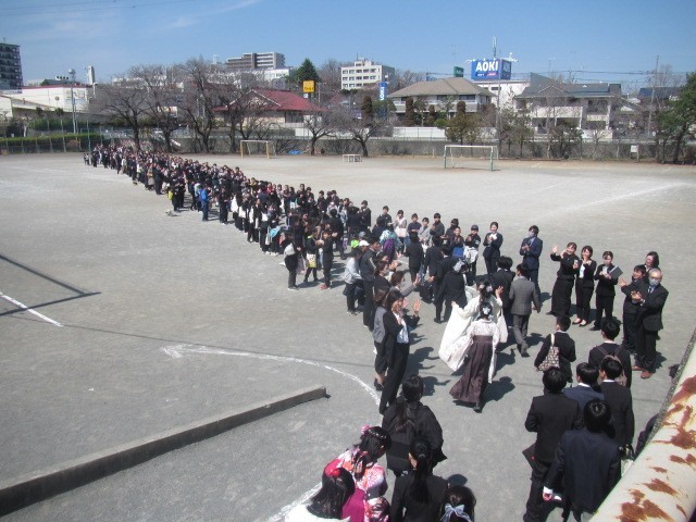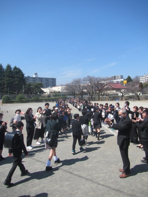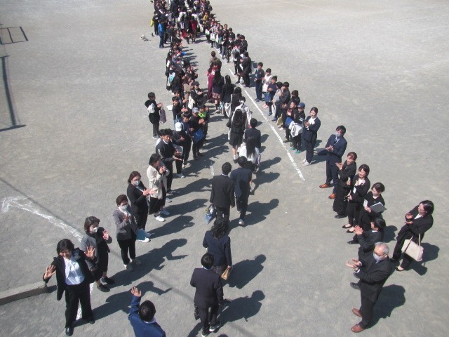 卒業式が終わり、記念撮影を行い、教室でのお話も終わり、校庭での門出送りとなりました。