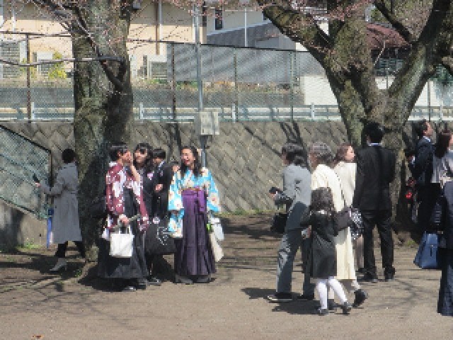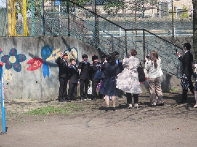 門出送りの花道をゴールまで行くと、少しだけ咲き出した桜の木の下で、記念撮影会が開かれました。