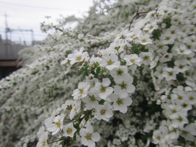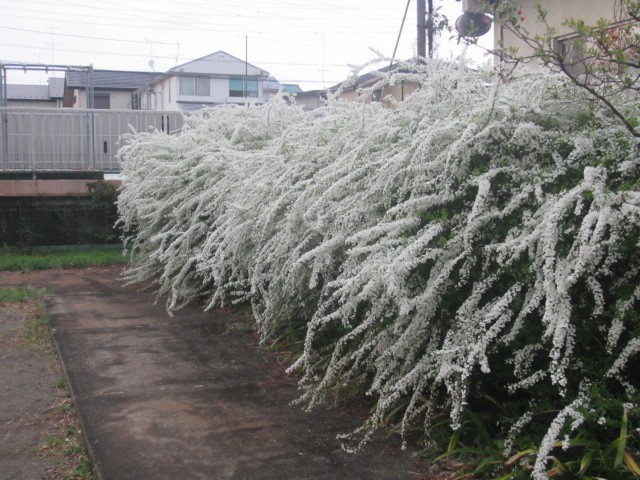 プールと校舎の間、更衣室や学習用砂場のところのユキヤナギは、吹き出すように咲いています。(写真上)