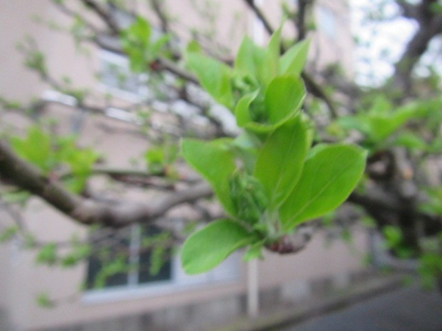 同じくプールと校舎の間、体育館の側の姫リンゴは若葉がまぶしいくらいです。(写真下)