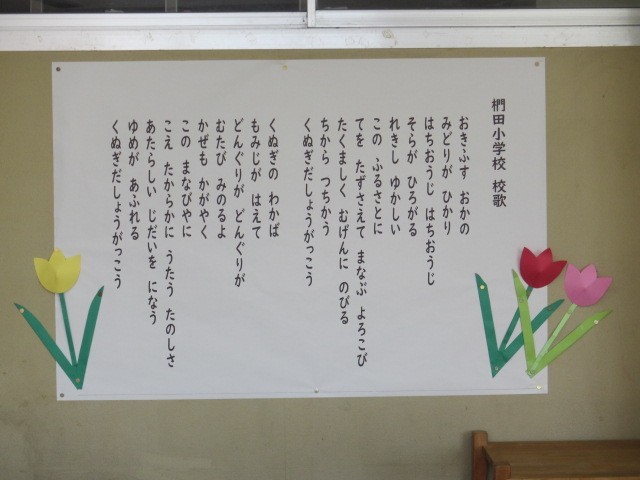 教室の中(廊下側の掲示板)には、椚田小の校歌が掲出されています。(写真上)