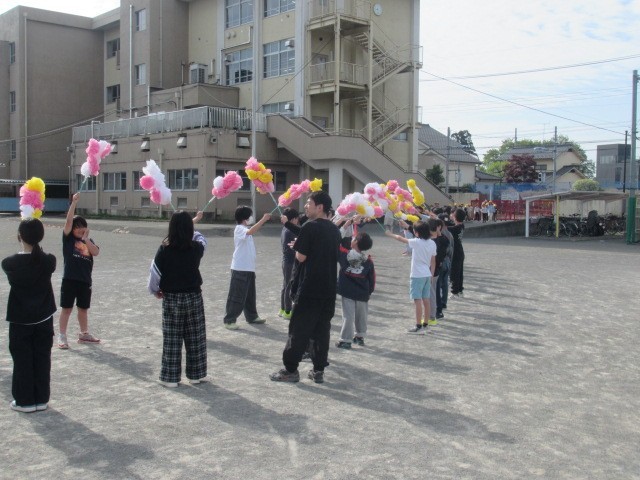 5年生の花のアーチの下を通って(写真)全校の前に並びました。