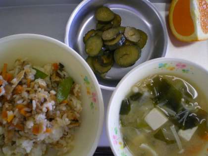 あなご寿司・ピリ辛きゅうり・味噌汁・清見オレンジ・牛乳
