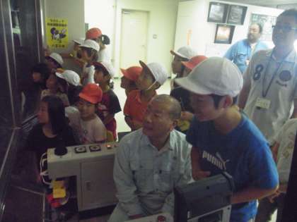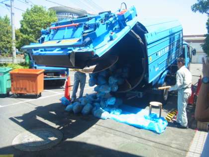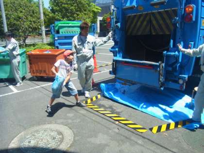北野清掃工場では、実際に「ごみ袋投入体験」をすることができました。また、ごみ収集車の仕組みも見させてもらいました。施設内ではごみピットのクレーン操作を見学しました。大きなクレーンがごみをつかむ様子を子供たちは目を大きくして見ていました。