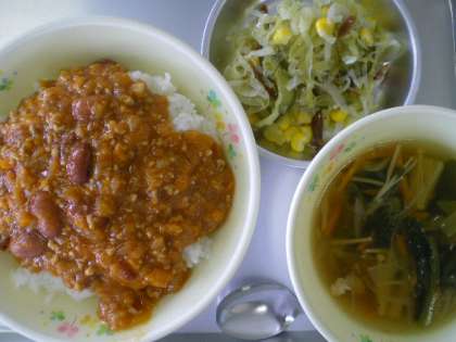 チリコンカンライス・ナッツサラダ・わかめスープ・牛乳