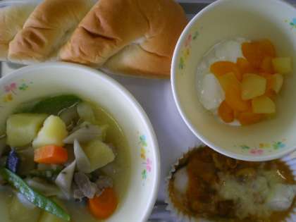 ねじりパン・白身魚のピザ焼き・鶏肉と牛蒡のさっぱりスープ煮・フルーツヨーグルト・牛乳