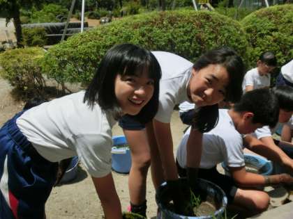 5年生がバケツ稲を栽培します。地域の小坂さんからいただいた立派な稲を植えました。20日(木)には小坂さんの田んぼに田植えに行きます。