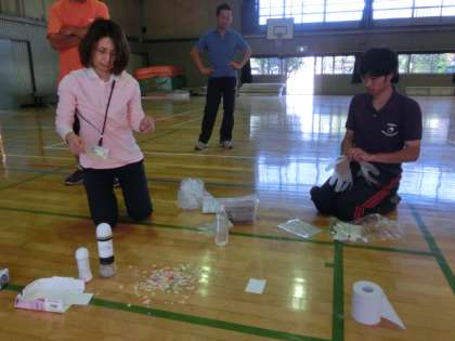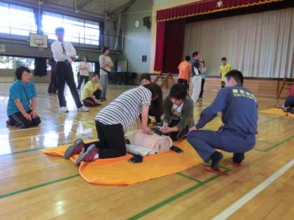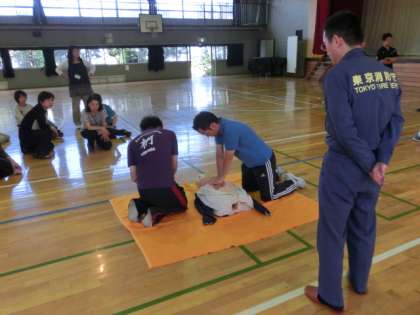 みんな真剣に行っています。垂直にリズムよく行うのは、なかなか難しいようです。また、AEDの使い方も学習しました。