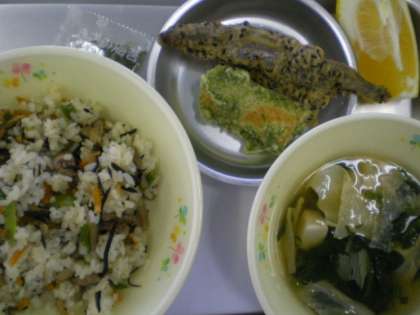 かやくごはん・ちくわとししゃもの二色揚げ・湯葉のお吸い物・くだもの・牛乳