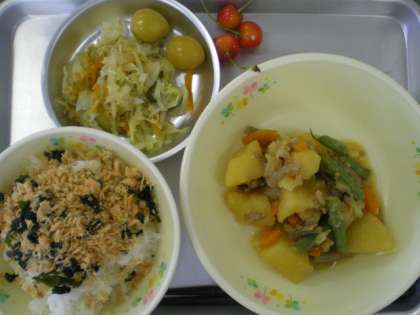 ご飯・鮭ふりかけ・肉じゃが・和風サラダ玉子添え・くだもの・牛乳