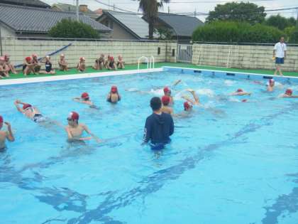 6月14日(金)学校公開の午後、5年生がプールに入りました。月曜日にプール開きをしてから、梅雨模様の天気でしたが、この日の午後は薄日が差し、暑くなりました。椚田小のプール一番乗りは5年生でした。