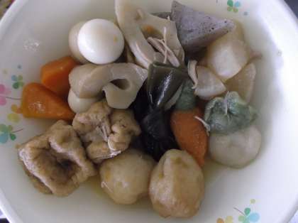 おでんは9種類の具が入っています。カブと人参の形をしたさつま揚げは