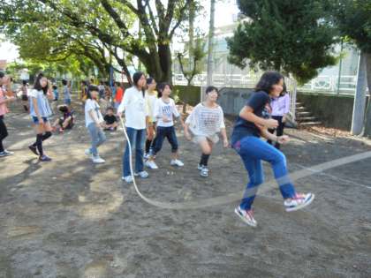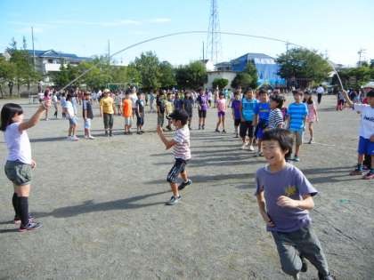 10月8日(火)、体育朝会で大縄跳び記録会を行いました。各学級ごとに5分間で何回跳べたかを記録します。この日のために、一生懸命練習している様子が、休み時間にも見られました。失敗した子がいても、「大丈夫だよ。」と声をかけている姿が印象的でした。この記事の詳しい様子は「全校行事」にも載せてあります。