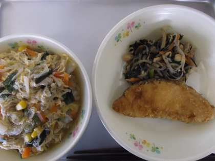 キムチクッパ・白身魚の香味揚げ・ひじきと白滝の炒め物・牛乳