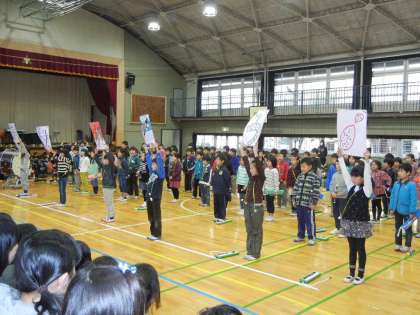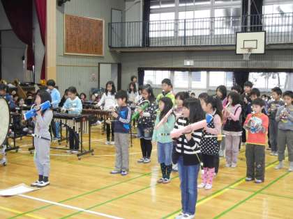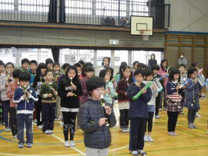 3年生は鍵盤ハーモニカ、リコーダー、打楽器で合奏してくれました。また、「ありがとう!」の5文字にちなんだ贈る言葉を伝えてくれました。