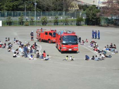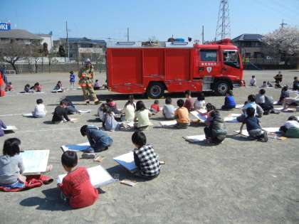 15日(火)、2年生が消防車の写生会を行いました。普段は間近に見ることもない消防車や消防隊員の方が来てくれて、いろいろと説明をしてくださいました。子供たちは画用紙いっぱいに大きな消防車を描いていました。