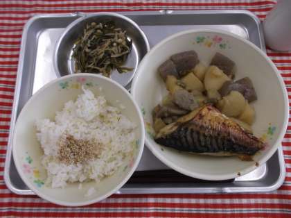 きびごはん さばのカレー焼き なめたけ 野菜の五目炒め 牛乳