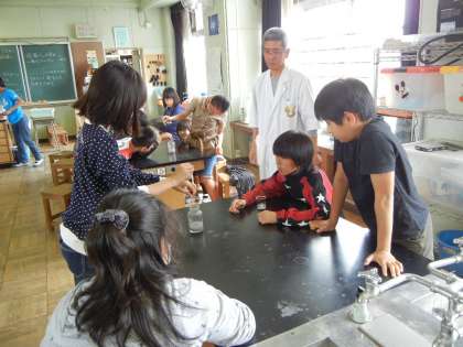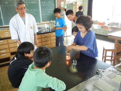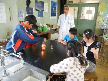 理科の授業風景です。この日は「物の燃え方」燃焼の実験でした。酸素がものの燃焼に深くかかわっていることとを学習しました。