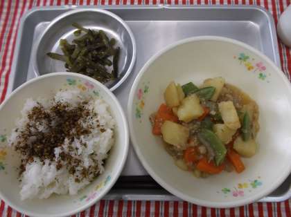 ごはん アーモンドふりかけ じゃがいものそぼろ煮 茎わかめの生姜炒め 牛乳